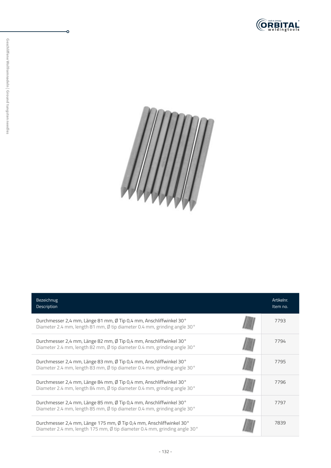 132 133 G esch liff en e W olfram n ad eln G rou n d tu n g sten n eed les Bezeichnug Description Artikelnr Item no Durchmesser 2 4 mm Länge 81 mm Ø Tip 0 4 mm Anschliffwinkel 30 Diameter 2 4 mm length 81 mm Ø tip diameter 0 4 mm grinding angle 30 7793 Durchmesser 2 4 mm Länge 82 mm Ø Tip 0 4 mm Anschliffwinkel 30 Diameter 2 4 mm length 82 mm Ø tip diameter 0 4 mm grinding angle 30 7794 Durchmesser 2 4 mm Länge 83 mm Ø Tip 0 4 mm Anschliffwinkel 30 Diameter 2 4 mm length 83 mm Ø tip diameter 0 4 mm grinding angle 30 7795 Durchmesser 2 4 mm Länge 84 mm Ø Tip 0 4 mm Anschliffwinkel 30 Diameter 2 4 mm length 84 mm Ø tip diameter 0 4 mm grinding angle 30 7796 Durchmesser 2 4 mm Länge 85 mm Ø Tip 0 4 mm Anschliffwinkel 30 Diameter 2 4 mm length 85 mm Ø tip diameter 0 4 mm grinding angle 30 7797 Durchmesser 2 4 mm Länge 175 mm Ø Tip 0 4 mm Anschliffwinkel 30 Diameter 2 4 mm length 175 mm Ø tip diameter 0 4 mm grinding angle 30 7839
