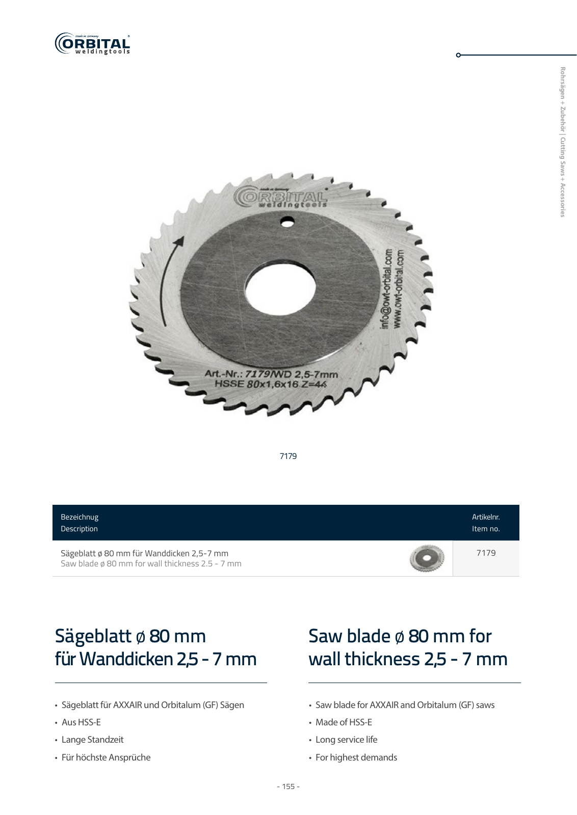 155 R oh rsäg en Zu b eh ör Cu ttin g Saw s A ccessories Sägeblatt ø 80 mm für Wanddicken 2 5 7 mm Saw blade ø 80 mm for wall thickness 2 5 7 mm Sägeblatt für AXXAIR und Orbitalum GF Sägen Aus HSS E Lange Standzeit Für höchste Ansprüche Saw blade for AXXAIR and Orbitalum GF saws Made of HSS E Long service life For highest demands Bezeichnug Description Artikelnr Item no Sägeblatt ø 80 mm für Wanddicken 2 5 7 mm Saw blade ø 80 mm for wall thickness 2 5 7 mm 7179 7179