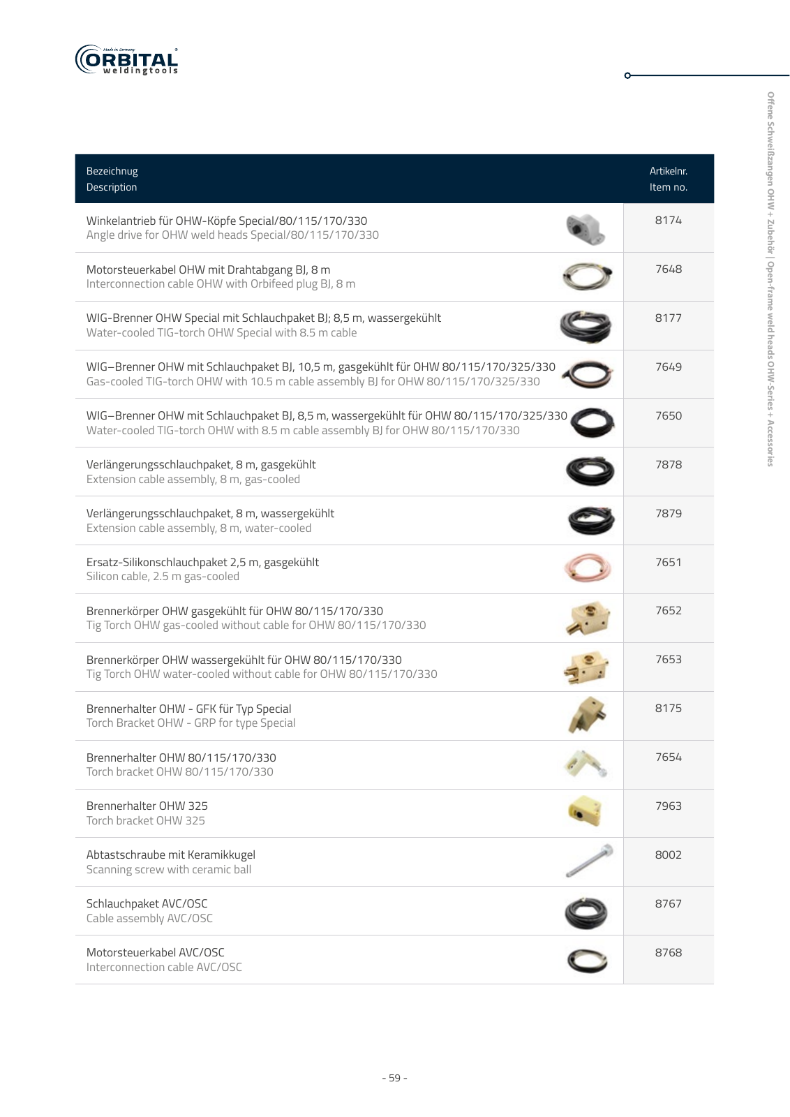 59 Bezeichnug Description Artikelnr Item no Winkelantrieb für OHW Köpfe Special 80 115 170 330 Angle drive for OHW weld heads Special 80 115 170 330 8174 Motorsteuerkabel OHW mit Drahtabgang BJ 8 m Interconnection cable OHW with Orbifeed plug BJ 8 m 7648 WIG Brenner OHW Special mit Schlauchpaket BJ 8 5 m wassergekühlt Water cooled TIG torch OHW Special with 8 5 m cable 8177 WIG Brenner OHW mit Schlauchpaket BJ 10 5 m gasgekühlt für OHW 80 115 170 325 330 Gas cooled TIG torch OHW with 10 5 m cable assembly BJ for OHW 80 115 170 325 330 7649 WIG Brenner OHW mit Schlauchpaket BJ 8 5 m wassergekühlt für OHW 80 115 170 325 330 Water cooled TIG torch OHW with 8 5 m cable assembly BJ for OHW 80 115 170 330 7650 Verlängerungsschlauchpaket 8 m gasgekühlt Extension cable assembly 8 m gas cooled 7878 Verlängerungsschlauchpaket 8 m wassergekühlt Extension cable assembly 8 m water cooled 7879 Ersatz Silikonschlauchpaket 2 5 m gasgekühlt Silicon cable 2 5 m gas cooled 7651 Brennerkörper OHW gasgekühlt für OHW 80 115 170 330 Tig Torch OHW gas cooled without cable for OHW 80 115 170 330 7652 Brennerkörper OHW wassergekühlt für OHW 80 115 170 330 Tig Torch OHW water cooled without cable for OHW 80 115 170 330 7653 Brennerhalter OHW GFK für Typ Special Torch Bracket OHW GRP for type Special 8175 Brennerhalter OHW 80 115 170 330 Torch bracket OHW 80 115 170 330 7654 Brennerhalter OHW 325 Torch bracket OHW 325 7963 Abtastschraube mit Keramikkugel Scanning screw with ceramic ball 8002 Schlauchpaket AVC OSC Cable assembly AVC OSC 8767 Motorsteuerkabel AVC OSC Interconnection cable AVC OSC 8768 O ff en e Schw eiß zan g en O H W Zu b eh ör O p en fram e w eld h ead s O H W Series A ccessories