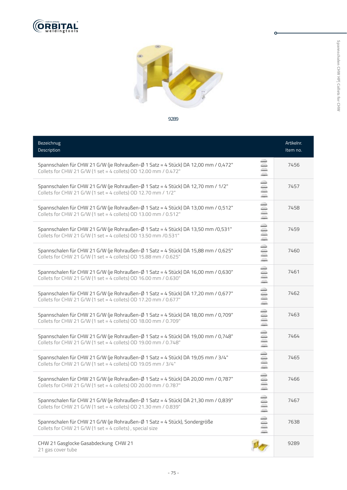75 Bezeichnug Description Artikelnr Item no Spannschalen für CHW 21 G W je Rohraußen Ø 1 Satz 4 Stück DA 12 00 mm 0 472 Collets for CHW 21 G W 1 set 4 collets OD 12 00 mm 0 472 7456 Spannschalen für CHW 21 G W je Rohraußen Ø 1 Satz 4 Stück DA 12 70 mm 1 2 Collets for CHW 21 G W 1 set 4 collets OD 12 70 mm 1 2 7457 Spannschalen für CHW 21 G W je Rohraußen Ø 1 Satz 4 Stück DA 13 00 mm 0 512 Collets for CHW 21 G W 1 set 4 collets OD 13 00 mm 0 512 7458 Spannschalen für CHW 21 G W je Rohraußen Ø 1 Satz 4 Stück DA 13 50 mm 0 531 Collets for CHW 21 G W 1 set 4 collets OD 13 50 mm 0 531 7459 Spannschalen für CHW 21 G W je Rohraußen Ø 1 Satz 4 Stück DA 15 88 mm 0 625 Collets for CHW 21 G W 1 set 4 collets OD 15 88 mm 0 625 7460 Spannschalen für CHW 21 G W je Rohraußen Ø 1 Satz 4 Stück DA 16 00 mm 0 630 Collets for CHW 21 G W 1 set 4 collets OD 16 00 mm 0 630 7461 Spannschalen für CHW 21 G W je Rohraußen Ø 1 Satz 4 Stück DA 17 20 mm 0 677 Collets for CHW 21 G W 1 set 4 collets OD 17 20 mm 0 677 7462 Spannschalen für CHW 21 G W je Rohraußen Ø 1 Satz 4 Stück DA 18 00 mm 0 709 Collets for CHW 21 G W 1 set 4 collets OD 18 00 mm 0 709 7463 Spannschalen für CHW 21 G W je Rohraußen Ø 1 Satz 4 Stück DA 19 00 mm 0 748 Collets for CHW 21 G W 1 set 4 collets OD 19 00 mm 0 748 7464 Spannschalen für CHW 21 G W je Rohraußen Ø 1 Satz 4 Stück DA 19 05 mm 3 4 Collets for CHW 21 G W 1 set 4 collets OD 19 05 mm 3 4 7465 Spannschalen für CHW 21 G W je Rohraußen Ø 1 Satz 4 Stück DA 20 00 mm 0 787 Collets for CHW 21 G W 1 set 4 collets OD 20 00 mm 0 787 7466 Spannschalen für CHW 21 G W je Rohraußen Ø 1 Satz 4 Stück DA 21 30 mm 0 839 Collets for CHW 21 G W 1 set 4 collets OD 21 30 mm 0 839 7467 Spannschalen für CHW 21 G W je Rohraußen Ø 1 Satz 4 Stück Sondergröße Collets for CHW 21 G W 1 set 4 collets special size 7638 CHW 21 Gasglocke Gasabdeckung CHW 21 21 gas cover tube 9289 9289 Sp an n sch alen C H W H P Collets for C H W