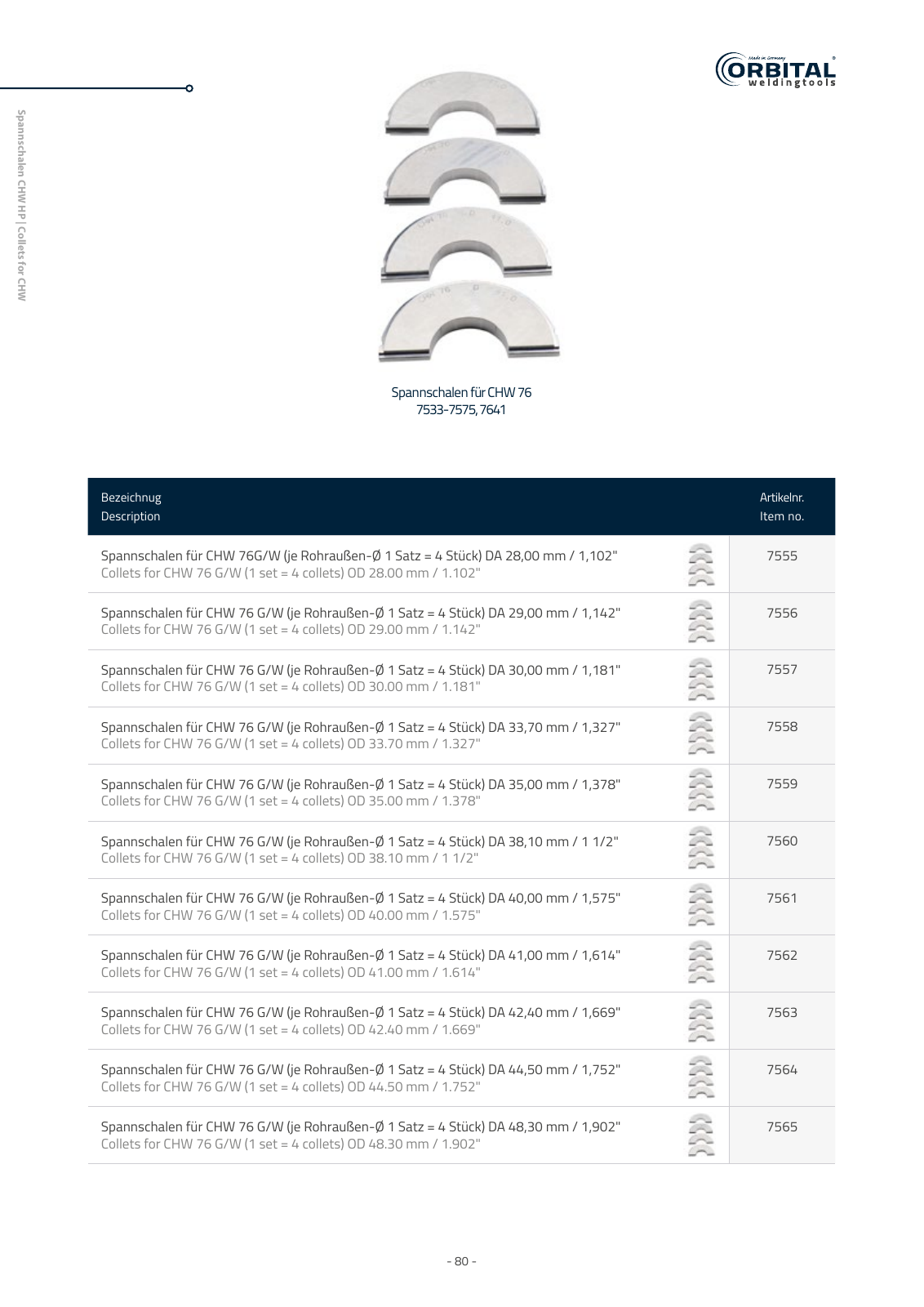 80 81 Bezeichnug Description Artikelnr Item no Spannschalen für CHW 76G W je Rohraußen Ø 1 Satz 4 Stück DA 28 00 mm 1 102 Collets for CHW 76 G W 1 set 4 collets OD 28 00 mm 1 102 7555 Spannschalen für CHW 76 G W je Rohraußen Ø 1 Satz 4 Stück DA 29 00 mm 1 142 Collets for CHW 76 G W 1 set 4 collets OD 29 00 mm 1 142 7556 Spannschalen für CHW 76 G W je Rohraußen Ø 1 Satz 4 Stück DA 30 00 mm 1 181 Collets for CHW 76 G W 1 set 4 collets OD 30 00 mm 1 181 7557 Spannschalen für CHW 76 G W je Rohraußen Ø 1 Satz 4 Stück DA 33 70 mm 1 327 Collets for CHW 76 G W 1 set 4 collets OD 33 70 mm 1 327 7558 Spannschalen für CHW 76 G W je Rohraußen Ø 1 Satz 4 Stück DA 35 00 mm 1 378 Collets for CHW 76 G W 1 set 4 collets OD 35 00 mm 1 378 7559 Spannschalen für CHW 76 G W je Rohraußen Ø 1 Satz 4 Stück DA 38 10 mm 1 1 2 Collets for CHW 76 G W 1 set 4 collets OD 38 10 mm 1 1 2 7560 Spannschalen für CHW 76 G W je Rohraußen Ø 1 Satz 4 Stück DA 40 00 mm 1 575 Collets for CHW 76 G W 1 set 4 collets OD 40 00 mm 1 575 7561 Spannschalen für CHW 76 G W je Rohraußen Ø 1 Satz 4 Stück DA 41 00 mm 1 614 Collets for CHW 76 G W 1 set 4 collets OD 41 00 mm 1 614 7562 Spannschalen für CHW 76 G W je Rohraußen Ø 1 Satz 4 Stück DA 42 40 mm 1 669 Collets for CHW 76 G W 1 set 4 collets OD 42 40 mm 1 669 7563 Spannschalen für CHW 76 G W je Rohraußen Ø 1 Satz 4 Stück DA 44 50 mm 1 752 Collets for CHW 76 G W 1 set 4 collets OD 44 50 mm 1 752 7564 Spannschalen für CHW 76 G W je Rohraußen Ø 1 Satz 4 Stück DA 48 30 mm 1 902 Collets for CHW 76 G W 1 set 4 collets OD 48 30 mm 1 902 7565 Sp an n sch alen C H W H P Collets for C H W Spannschalen für CHW 76 7533 7575 7641